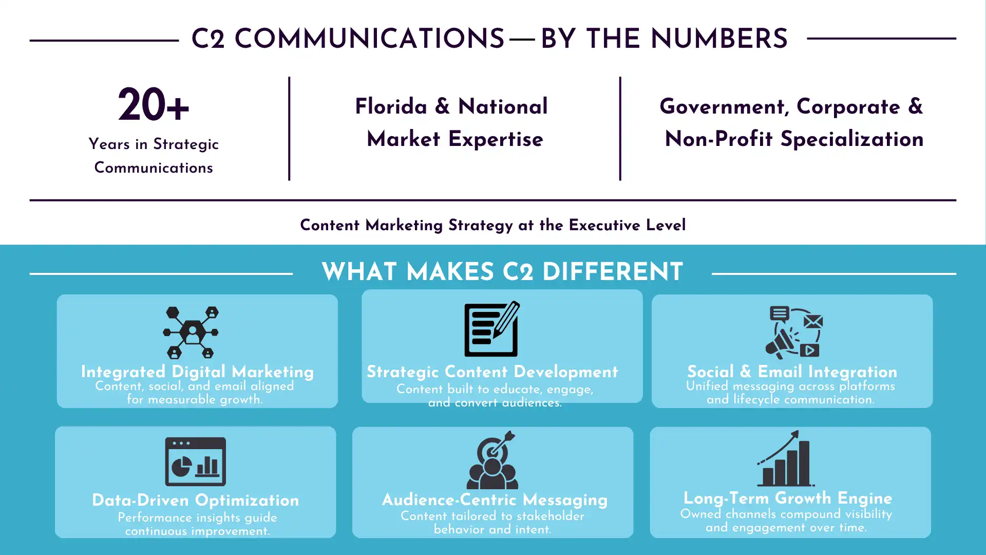 At C2 Communications, we approach digital marketing as a coordinated system. As a strategic content marketing agency, we align messaging, content, and distribution across channels—ensuring every initiative supports measurable growth and long-term brand authority.