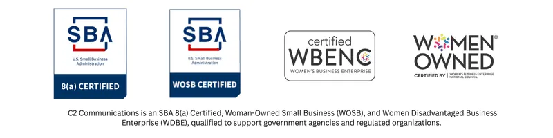 C2 Communications is an SBA 8(a) Certified, Woman-Owned Small Business (WOSB), and Women Disadvantaged Business Enterprise (WDBE) qualified to support federal, state, and local government agencies.