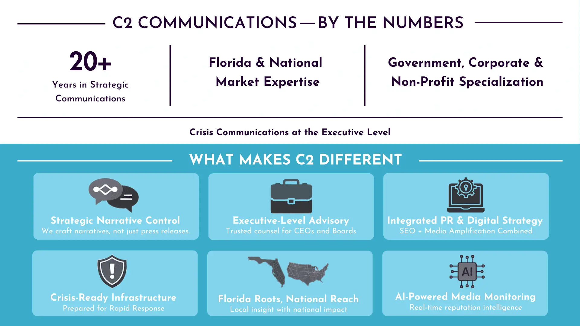 Internal teams manage daily operations — a PR agency brings strategic capacity, media relationships, and crisis-readiness that most organizations can’t maintain in-house. C2 acts as a force multiplier, stepping in with the right expertise before a situation demands it.